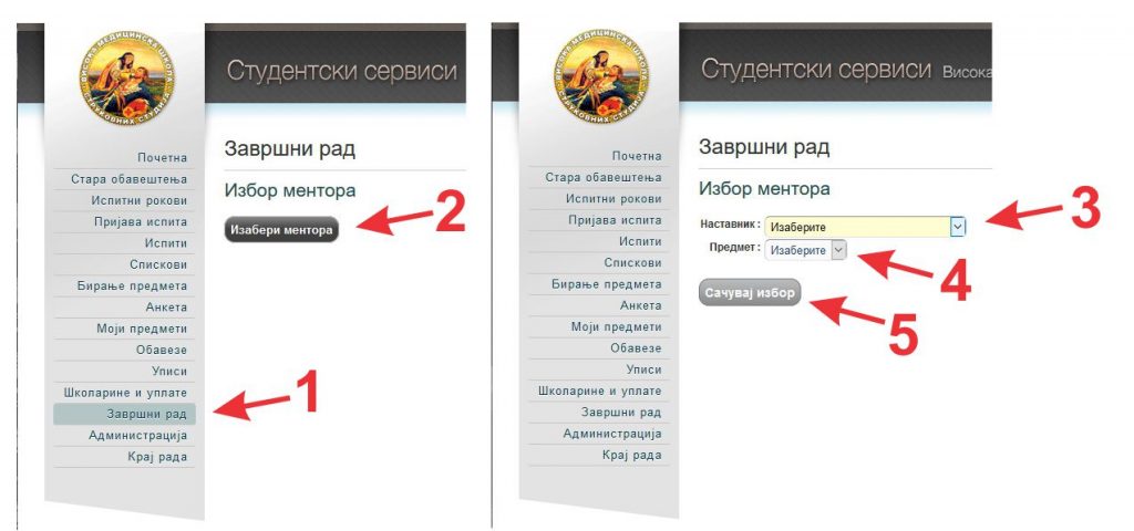 Студенти треће године свих студијских програма основних струковних студија, као и студенти завршне године мастер струковних студија у обавези су да изаберу ментора за израду завршног рада са листе ментора усвојене на Наставно-стручном већу Одсека медицинских студија Ћуприја